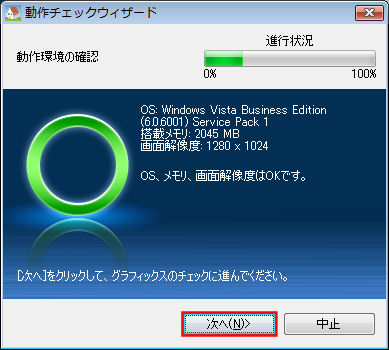 - OS、メモリ、画面解像度のチェックが完了したら[次へ]をクリックします。