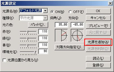 [ 光源設定 ]ウィンドウの[ 光源の追加 ]ボタンをクリックし、新規光源を追加します。 |