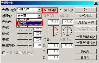 光源のON/OFFの[ ON ]にチェックを入れ、種類を[ 点光源 ]に設定します。