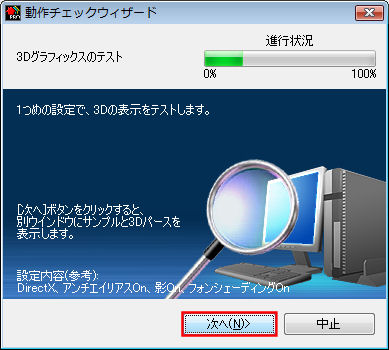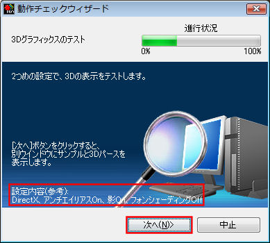- 動作チェックウィザードの[次へ]をクリックして、チェックを開始します。