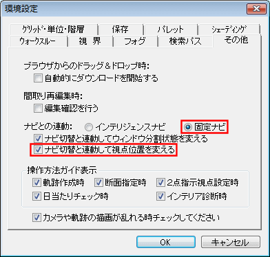 3. 「ナビとの連動」を「固定ナビ」に切り替え、「ナビ切替と連動してウィンドウ分割状態を変える」「ナビ切替と連動して視点位置を変える」のチェックを切り替えて[OK]をクリックします。