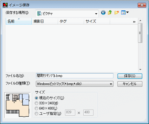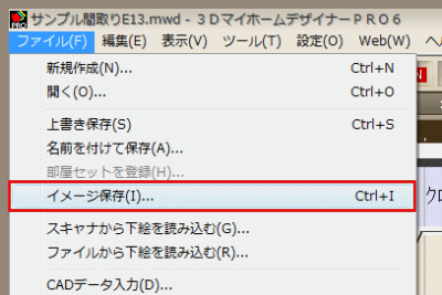 - 間取り画面の「ファイル」メニューから「イメージ保存」を選択します。
