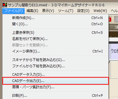 - 間取り画面の「ファイル」メニューから[CADデータ出力]を選択します。