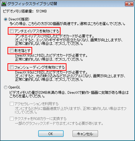 - [グラフィックスライブラリ切替]で、「アンチエイリアスを有効にする」「影を落とす」「フォンシェーディングを有効にする」のチェックを外して[OK]ボタンをクリックします。