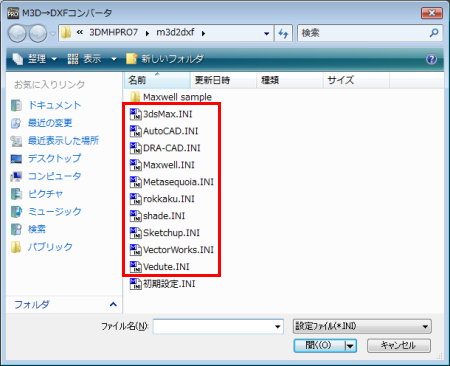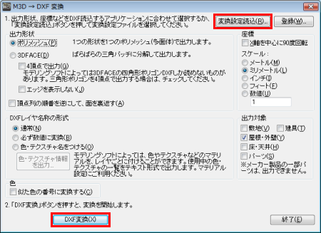 - [M3D→DXF変換]で[変換設定読込]をクリックします。