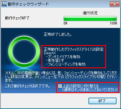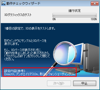 - [次へ]をクリックして、別の設定でビデオボードのチェックをおこないます。