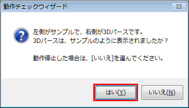 - サンプルとパース図が同じように表示されたら確認メッセージの[はい]をクリックし、[動作チェックウィザード]の[終了]をクリックします。