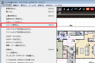 1. 間取り画面の「ファイル」メニューから「イメージ保存」を選択します。
