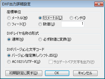 - [詳細設定]ボタン:DXF出力する座標単位、レイヤ名称の形式を設定します。