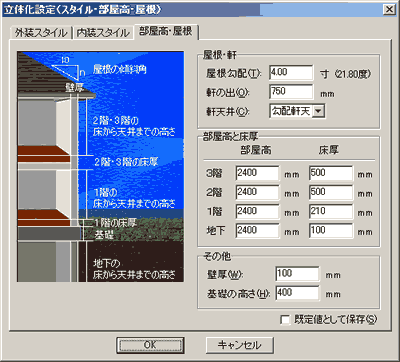 床厚や部屋高の数値などは、間取り画面の「設定」メニュー「立体化設定(外装・内装・部屋高・屋根)」で、「部屋高・屋根」タブで設定できます。