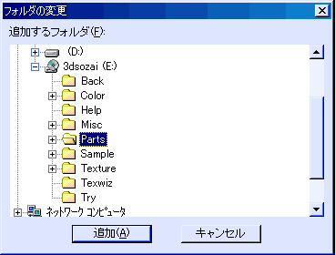 「フォルダの変更」画面で、CD-ROMドライブ「3dsozai」の中の「Parts」を選択し、「追加」をクリックします。 |