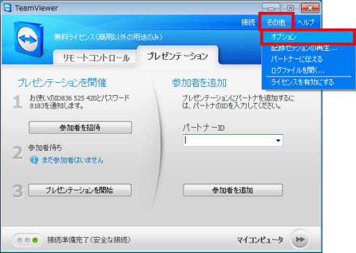 - 「TeamViewer」のメイン画面で、[その他]メニューの[オプション]を選択します。