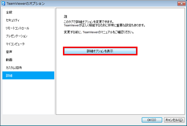 - 表示された[TeamViewerのオプション]で[詳細]を選択し、「クイック接続ボタン」の[設定]ボタンをクリックします。