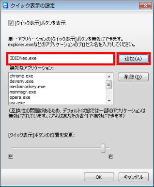 - 表示された[クイック表示の設定]で、入力欄に3D画面を実行するプログラム名「3DIDNeo.exe」と入力し、[追加]ボタンをクリックします。