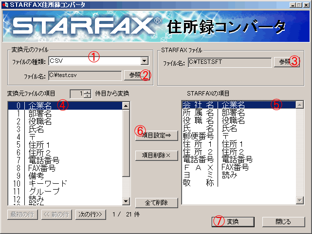 D「変換元ファイルの項目」欄で選択した項目「企業名」を「STARFAXの項目」欄の「会社名」に割り当てたいので