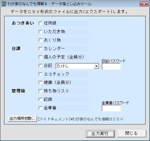 - 「waga6csv.exe」をダブルクリックして、「わが家のなんでも情報6・データ落とし込みツール」を起動します。