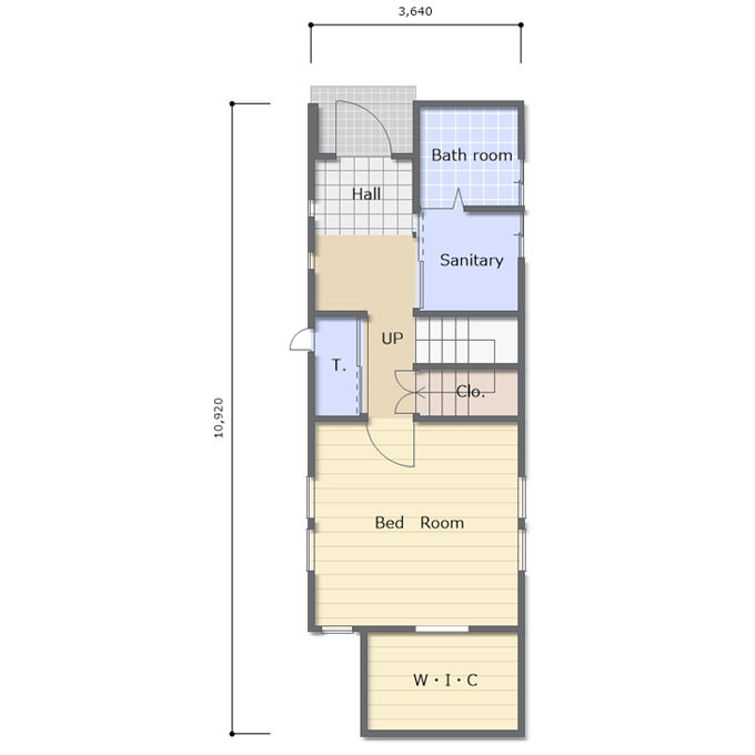 建物を凹ませて奥にある主寝室の採光は南側からとるようにプランニングしました。寝室南側にはウォークインクロゼットが3帖あります。本来は居室を一番南側に持っていきたいのですが、建て込んでいる地域を想定しているので、あえて隣地南側から離して窓が取れるようにお部屋を配置しています。