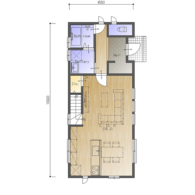 玄関、東西の間口2.5間(4550㎜)、南北の奥行が6.0間(10920㎜)の参考プランです。