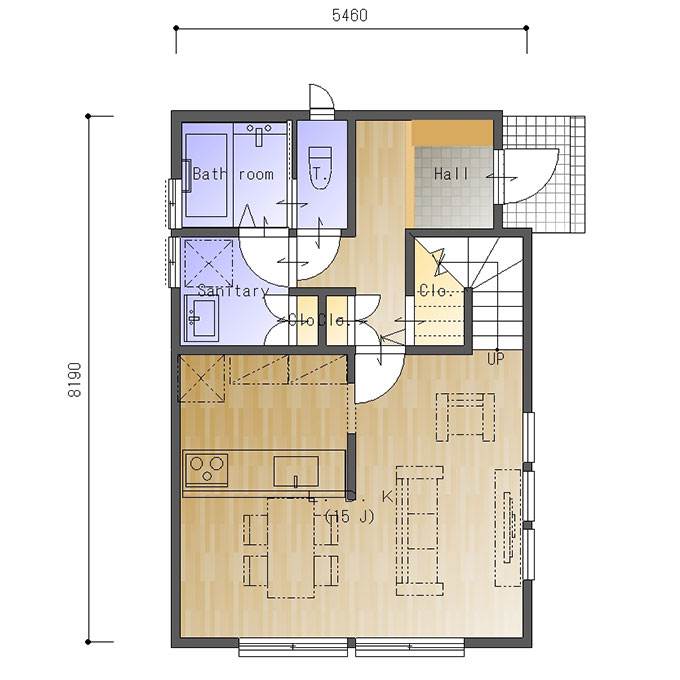 東玄関、東西の間口3.0間(5460㎜)、南北の奥行が4.5間(8190㎜)の参考プランです。
