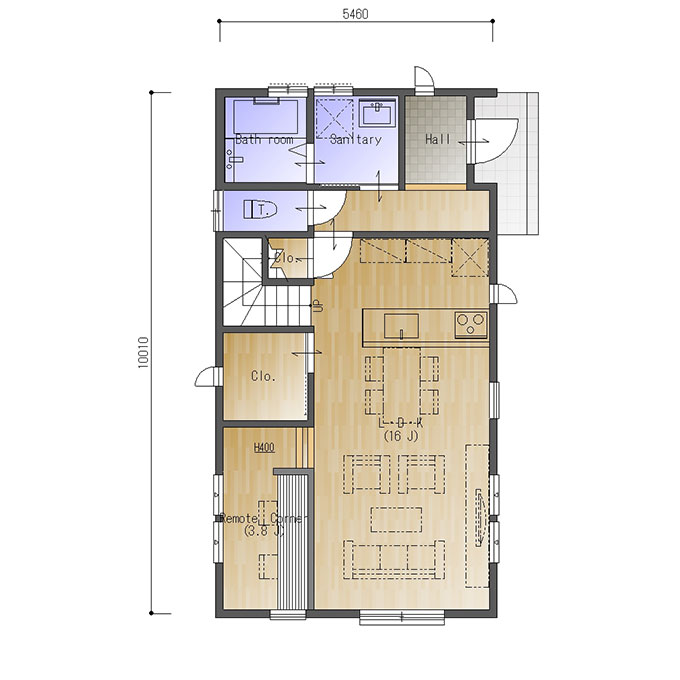 東玄関、東西の間口3.0間(5460㎜)、南北の奥行が5.5間(10010㎜)の参考プランです。