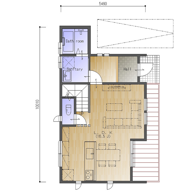 東玄関、東西の間口3.0間(5460㎜)、南北の奥行が5.5間(10010㎜)の参考プランです。