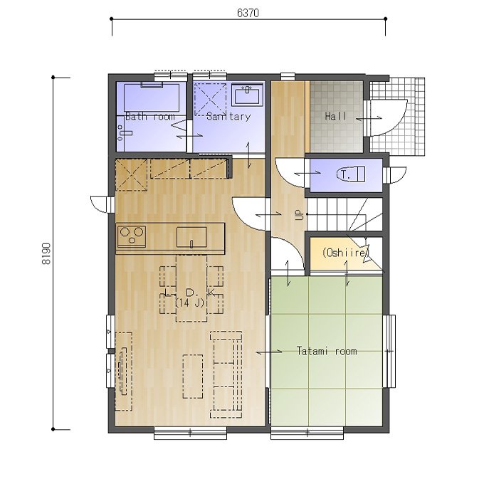 東玄関、間口が3.5間(6370㎜)、奥行が4.5間(8190㎜)の参考プランです。