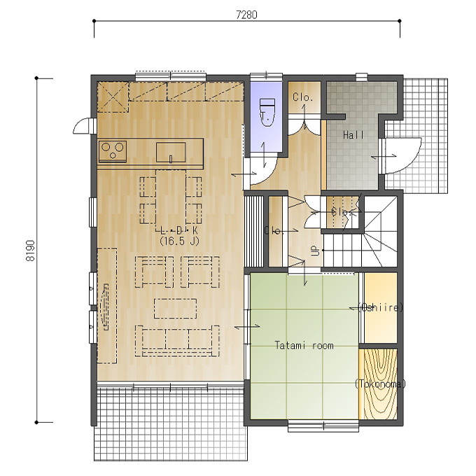 東玄関、東西の間口4.0間(7280㎜)、南北の奥行が4.5間(8190㎜)の参考プランです。