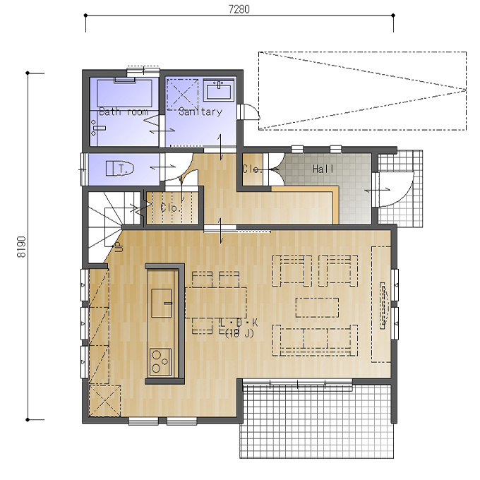 東玄関、東西の間口4.0間(7280㎜)、南北の奥行が4.5間(8190㎜)の参考プランです。