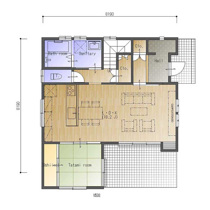 東玄関、東西の間口4.5間(8190㎜)、南北の奥行が5.0間(9100㎜)に収まる参考プランです。