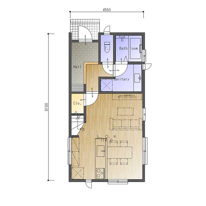 北玄関、東西の間口2.5間(4550㎜)、南北の奥行が4.5間(8190㎜)の参考プラン、コンパクトな2LDKの間取りになります。