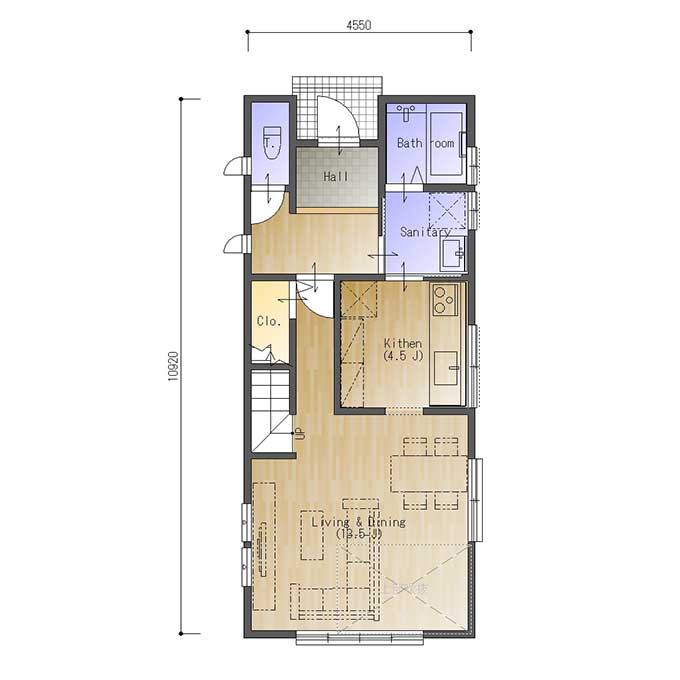 北玄関、東西の間口2.5間(4550㎜)、南北の奥行が6.0間(10920㎜)の参考プランです。