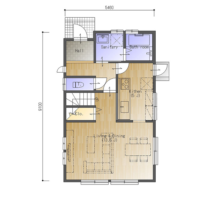 北玄関、東西の間口3.0間(5460㎜)、南北の奥行が5.0間(9100㎜)の参考プランです。
