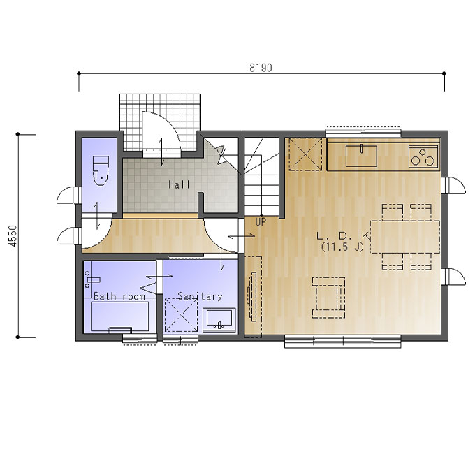 北玄関、東西の間口4.5間(8190㎜)、南北の奥行が2.5間(4550㎜)の参考プランです。