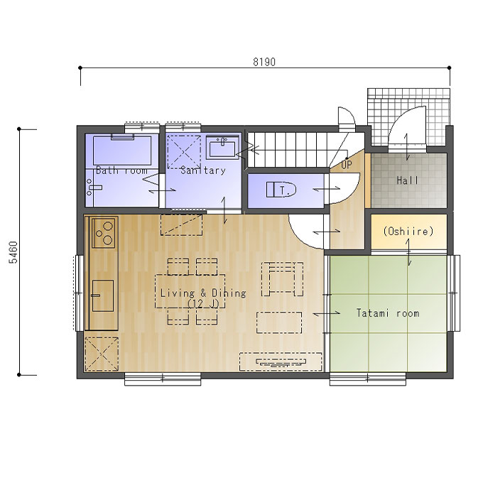 北玄関、東西の間口4.5間(8190㎜)、南北の奥行が3.0間(5460㎜)の参考プランです。