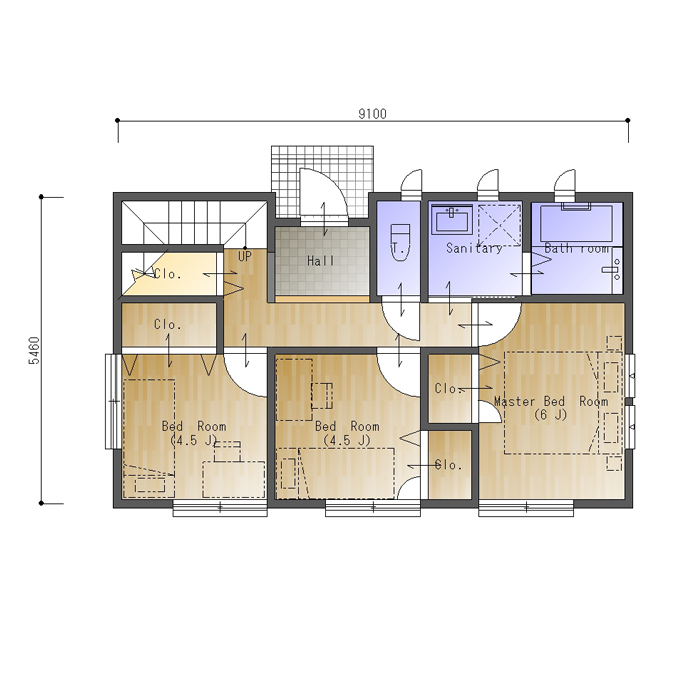 一階部分は北側に玄関と水回りを集め、南側に6帖の主寝室と4.5帖の子供部屋2室を設けたレイアウトです。クロゼットの配置を工夫したことで、デッドスペースがなく使いやすいお部屋になっています。
