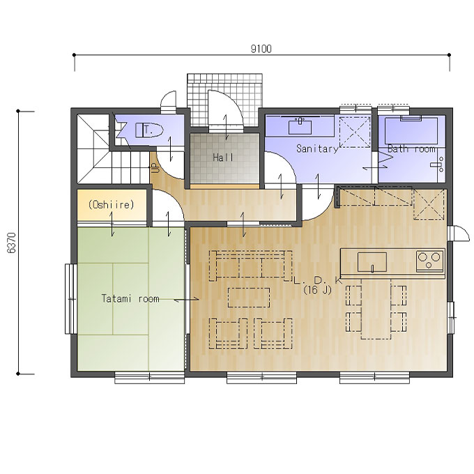 北玄関、間口が5.0間(9100㎜)、奥行が3.5間(6370㎜)の参考プランです。