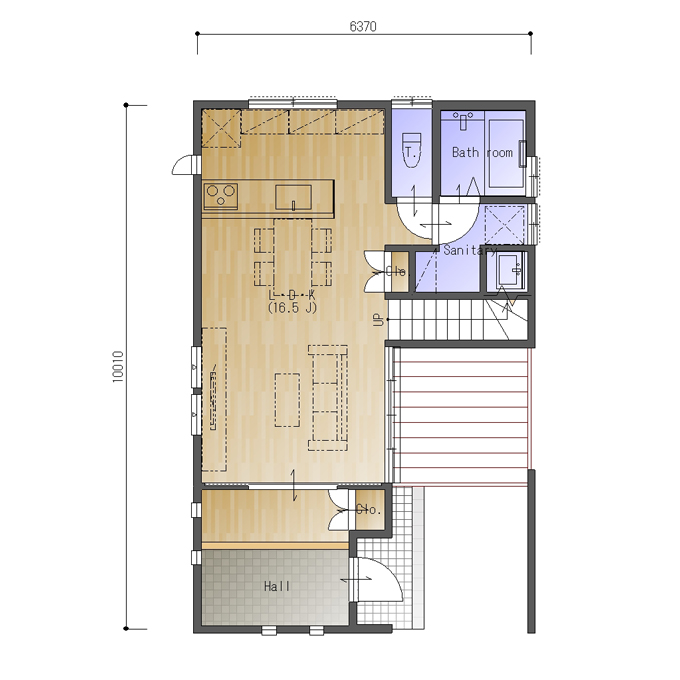 南玄関、東西の間口3.5間(6370㎜)、南北の奥行が5.5間(10010㎜)の参考プランです。