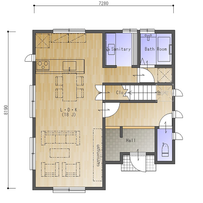 南玄関、東西の間口4.0間(7280㎜)、南北の奥行が4.5間(8190㎜)の参考プランです。