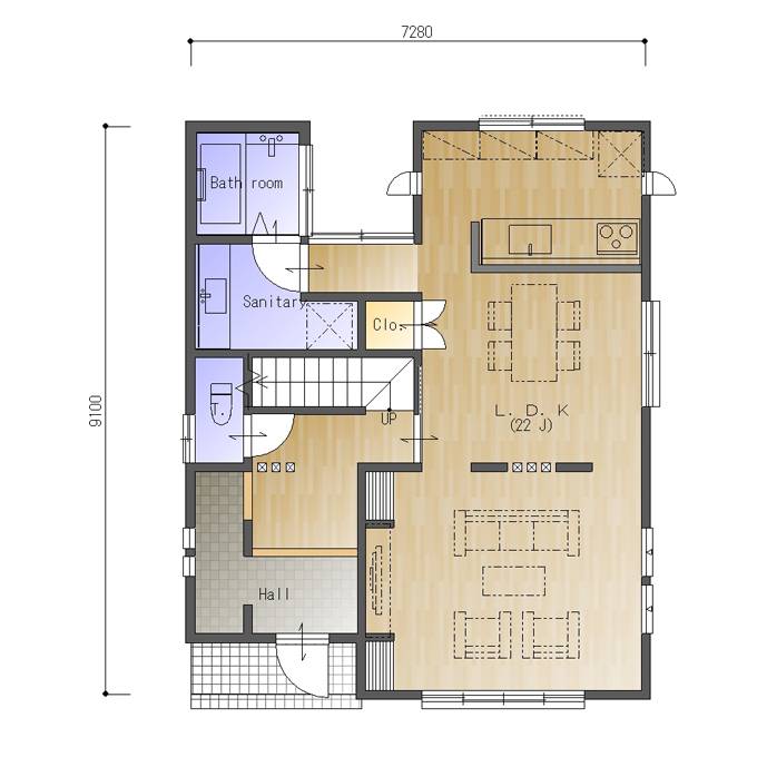 南玄関、東西の間口4.0間(7280㎜)、南北の奥行が5.0間(9100㎜)の参考プランです。