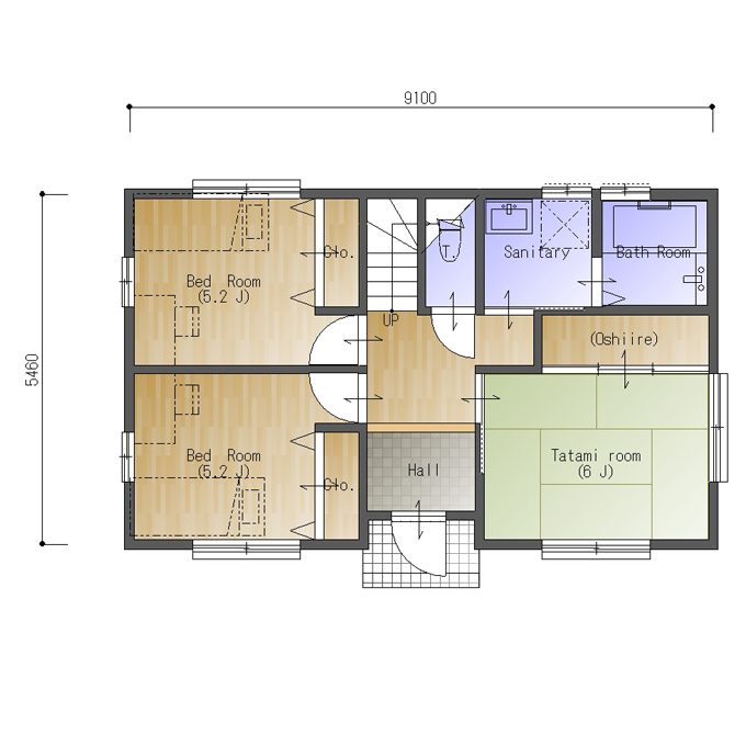 東西の間口が5.0間(9100㎜)、南北の奥行が3.0間(5460㎜)の南玄関の参考プランです。