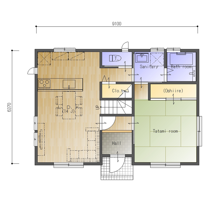 東西の間口5.0間(9100㎜)、南北の奥行が3.5間(6370㎜)の南玄関の参考プランです。