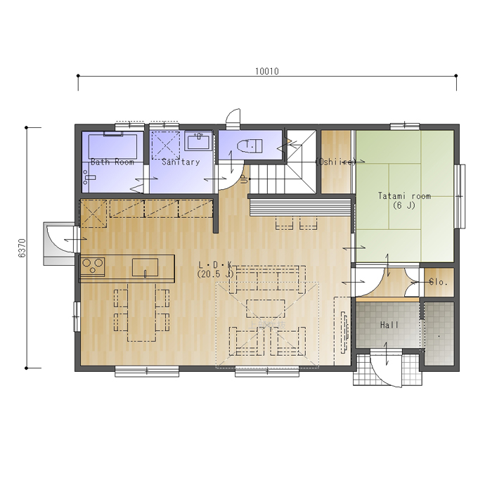 東西の間口5.5間(10010㎜)、南北の奥行が3.5間(6370㎜)の南玄関の参考プランです。
