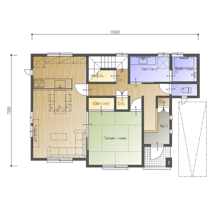 東西の間口6.0間(10920㎜)、南北の奥行が4.0間(7280㎜)の南玄関の参考プランです。