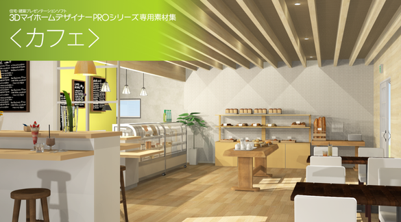 「3DマイホームデザイナーPROシリーズ専用素材集」は、3DマイホームデザイナーPROシリーズ(※注)で店舗デザイン、3Dパース図制作を行うための3Dパーツを収録した専用素材集です。