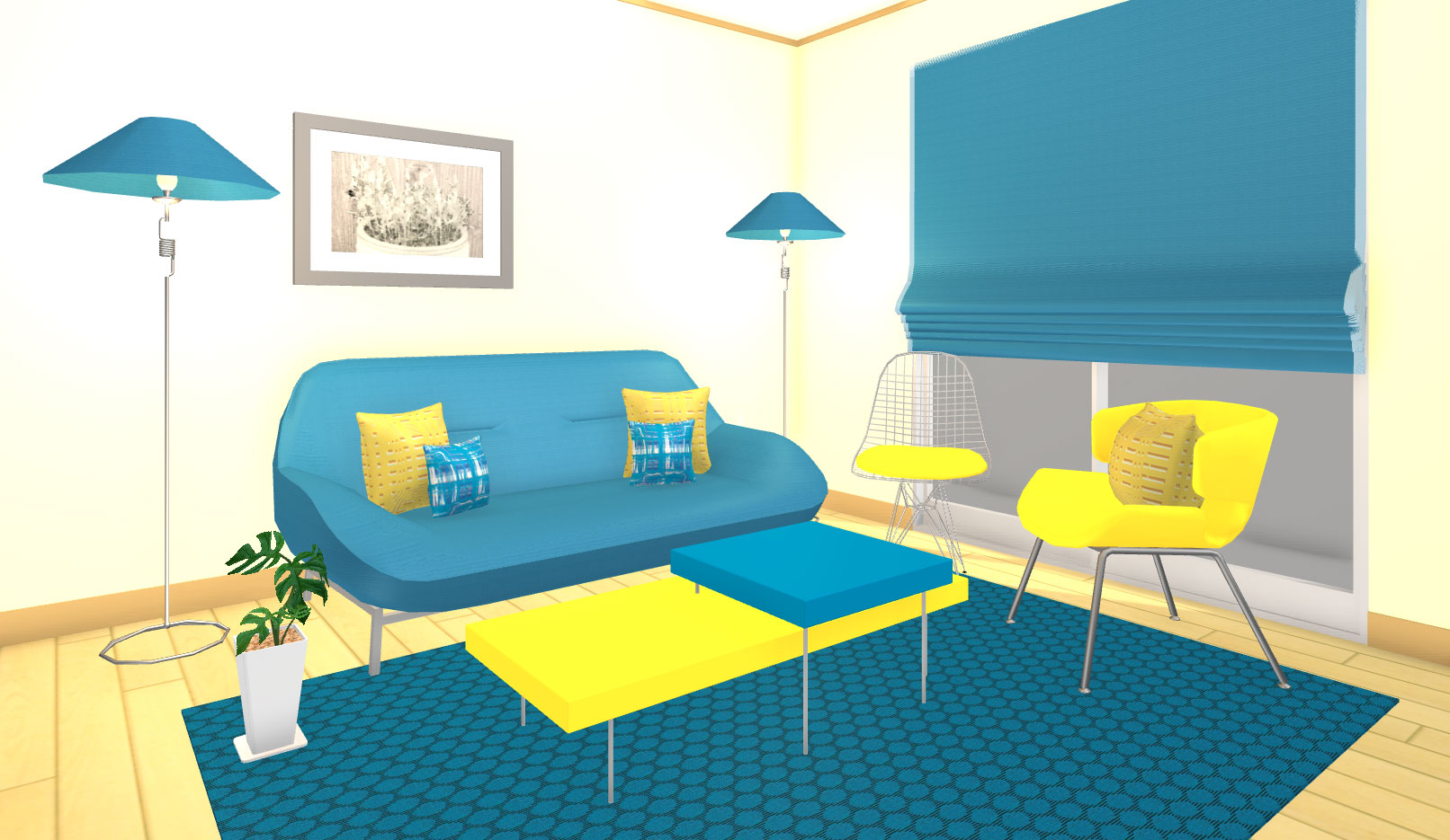 高彩度色で2色に絞った組み合わせは、商業インテリアに用いられると、より企業カラーやテーマが顧客に伝わりやすくなります。