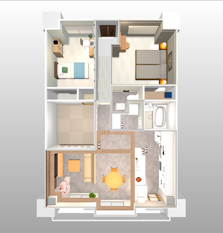 現在のキッチンはクローズドキッチンで狭い空間となっていますね。和室とともに開かれた空間になるよう間取りを考えていきましょう。