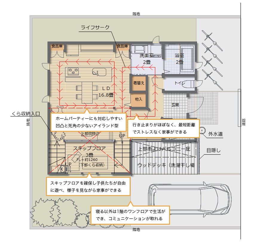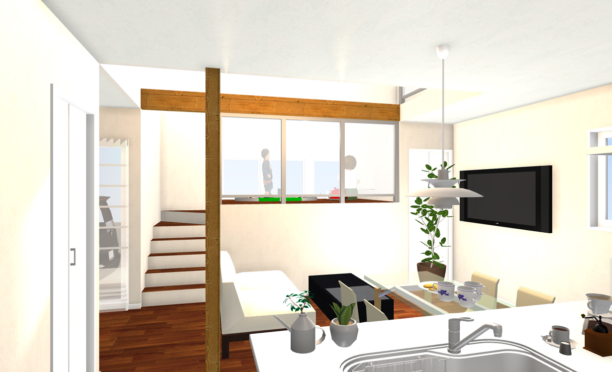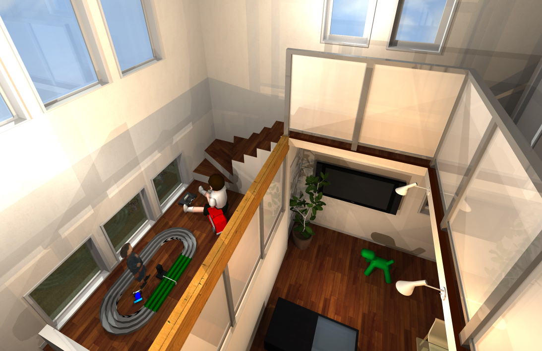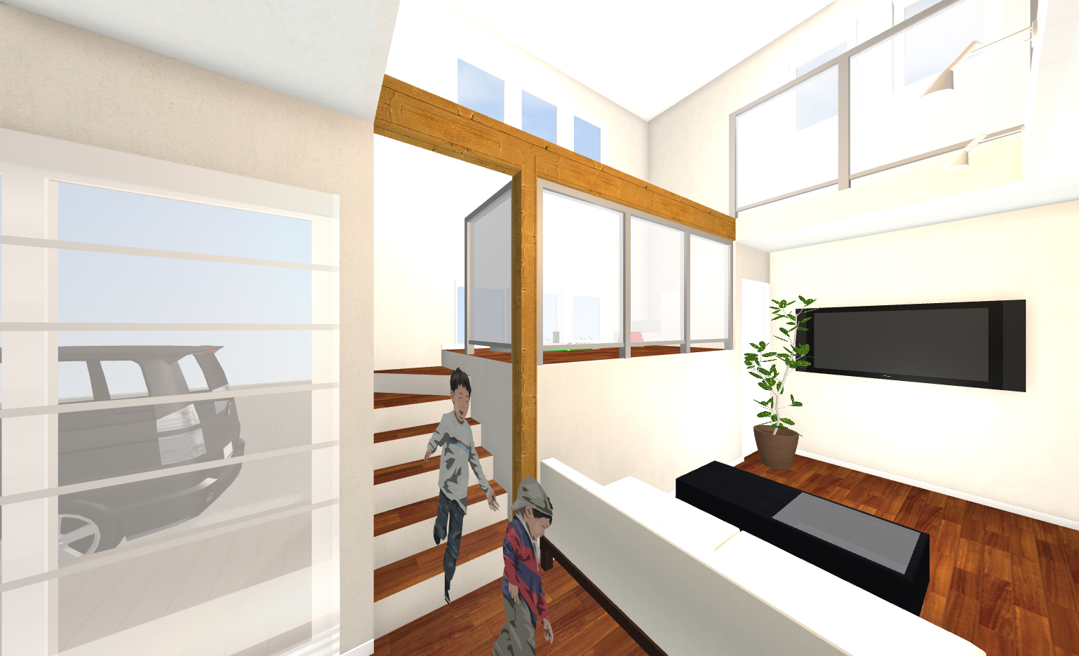 リビングスペースの中に、スキップフロアを確保する事で、子供たち専用の居場所を確保し自由に遊べるだけでなく、自立心の形成をはかります。