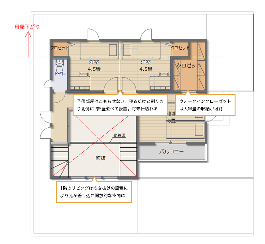 子供部屋はこもらせない、寝るだけ。として、北側に2部屋ならべて将来成長した後に仕切って二部屋にできる計画としました。