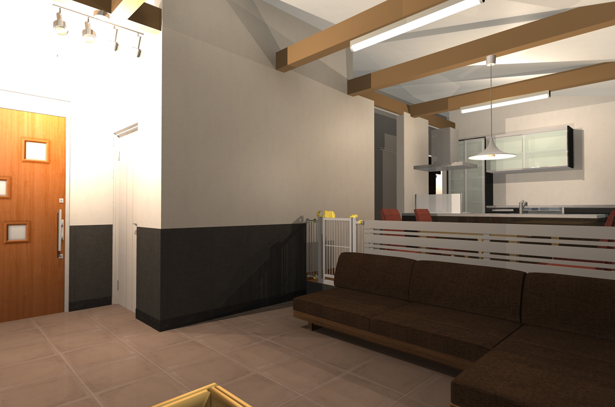 玄関とリビングをワンちゃんとの共用スペースとして区画し、床と腰壁までをタイルで計画しました。
