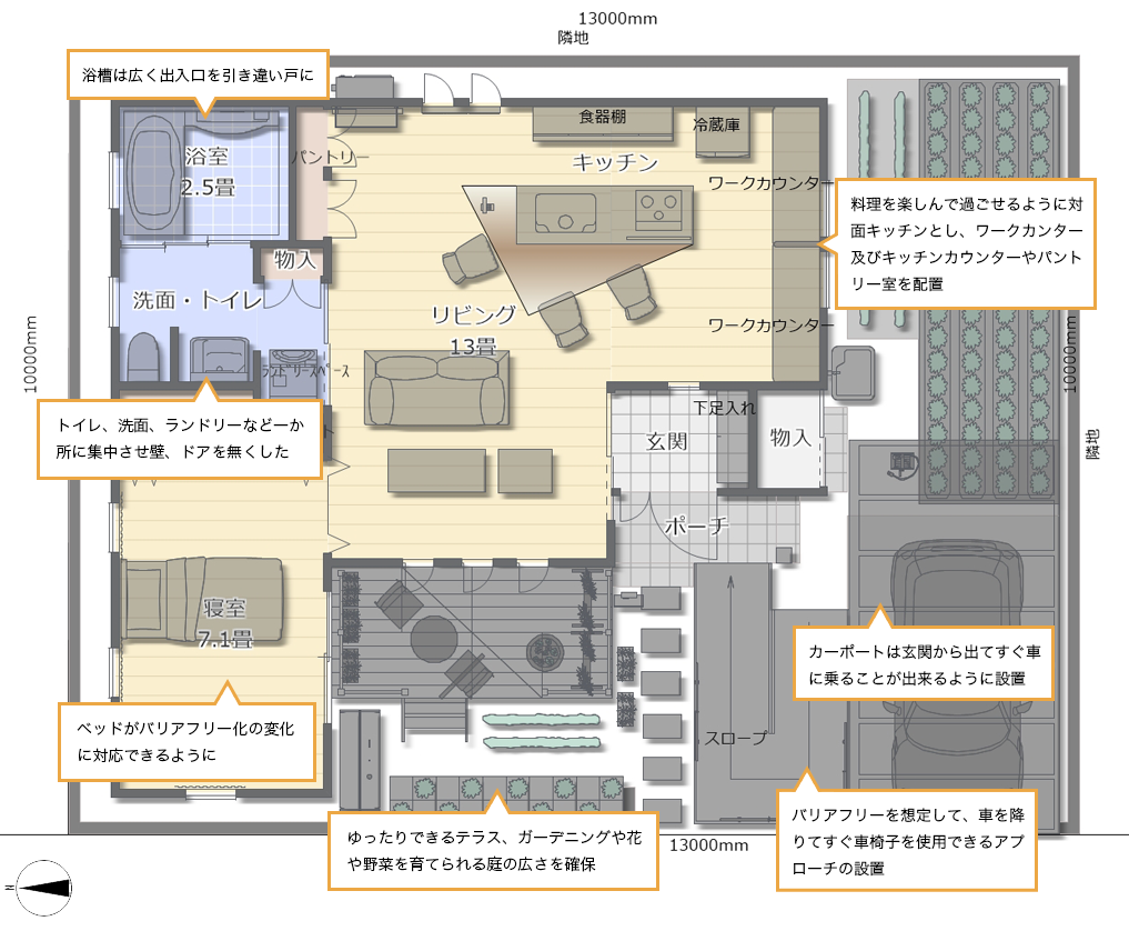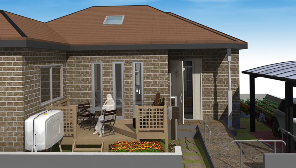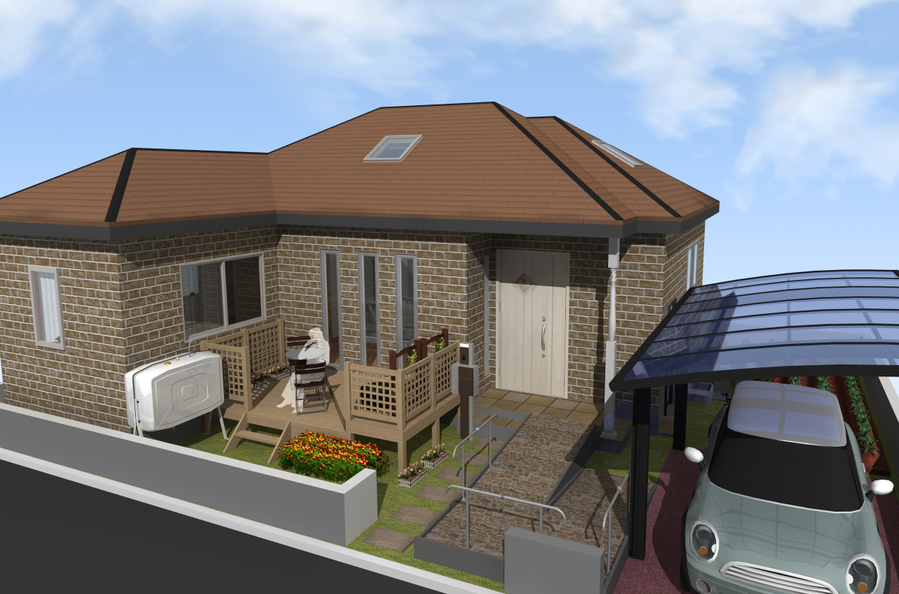 まずバリアフリーを想定して、車を降りてすぐ車椅子を使用できるアプローチの設置。